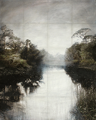 Artist John Folsom brings his complex and poetical integration of painting and photography to Callan Contemporary in a suite of new works, entitled Coastal Cartography. With his nuanced technique of merging the photographic image with densely layered and excavated oil paints, Folsom creates haunting odes to the natural world. For this body of work, the Atlanta-based artist photographed low-lying areas on the coast and inlet marshes of Georgia—primeval landscapes experiencing rising sea levels as a result of global warming. He captured images of lush swampland and evocative “bone-yards” of driftwood and live oak: lone trees with their trunks in the surf, waves washing over their roots, their contours suggesting a sculptural simplicity. These tableaux, by turns luxuriant and desolate, are harbingers of a changing world. “I feel an urgency to document these landscapes,” Folsom explains. “To me they’re an invitation to preservation.”