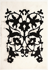 These inflections are further developed in Cole’s handmade paper pieces, which draw from her extensive catalogue of collected and manipulated patterns, a language the artist has consistently added to for years. Created at the Dieu Donné papermaking studio in New York City, each work combines pigmented cotton and abaca pulps to extract a unique image from a larger field, crafting an occasion for deep scrutiny and meditation on meaning. The intimacy, transparency and controlled elegance of these works contrasts sharply with the measured intensity of Seep, creating a range of emotional resonances not unlike those of a stranger in a strange land.