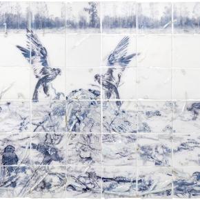 In her third solo exhibition with Callan Contemporary, “It Was Such a Beautiful Promise,” internationally acclaimed artist Sibylle Peretti reflects on our complex relationships with nature and the universal questions of meaning and longing. As pictorial and symbolically charged thematic motifs, pearls and strands of luxuriant beads recur throughout this new series of kiln-formed glass and acrylic panels. For centuries, pearls have embodied an intrinsic longing for shared values, cherished and passed on from generation to generation. “There is a connection to the promise of hope, healing, and resolution seen in these pearls,” Peretti observes. “They’re seductive and beautiful and symbolize something you deeply desire. You may find it, you may not; it all depends on your own perception.” Peretti frames these allegories as visual vignettes that unite landscape with narrative. Animals with symbiotic relationships with human beings, such as hawks, foxes, and coyotes, appear in enigmatic scenes, collecting pearls with which to perhaps adorn themselves, build their nests, or through simple fascination share an intrinsic desire for beauty. Children—another motif Peretti has revisited throughout her career—figure prominently in the imagery, conveying a sense of tenderness and wonder, blurring boundaries between innocence and experience, vulnerability and strength.
