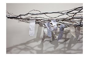Many of Bedsole’s sculptures incorporate fabrics, twigs, found papers, and texts that hold profound personal significance for the artist. Her works on handmade watercolor paper, some of which gleam with flat copper foil, incorporate many of the same materials and processes she uses in her sculpture. Many of the works have luscious patinas and textures as a result of being soaked, salted, mud-caked, dried, and enriched with passages from poems and books, further distilling the rich roux of meanings they embody. The pieces, she reflects, “are about letting go and releasing the past—trusting that there’s a compass to guide us through the fog, so we can let go of the shore and trust the sea.”