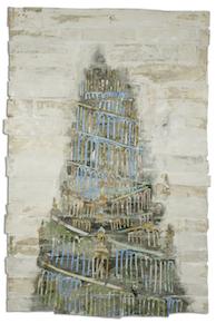 On an intriguing parallel course to her sculpture, Bedsole’s works on paper are also densely layered in surface and meaning. Integrating elements of painting, drawing, and collage, they draw upon themes from world mythology (as in the collage/drawing Penelope’s Tears and the collage/charcoal Babel), among other sources. Across the exhibition, Bedsole’s fascination with the metaphorical voyage of life shines through. She is inspired by T.S. Eliot’s poem, “Little Gidding,” one stanza of which elegantly sums up ideas central to her work: “We shall not cease from exploration/and the end of all our exploring/will be to arrive where we started/and know the place for the first time.