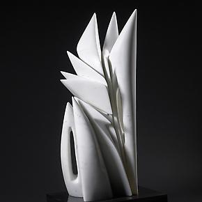 Predominantly vertical, Atchugarry’s works communicate aspiration and ascension in a way that recalls Constantine Brancusi’s masterpiece, Bird in Space. They are by turns playful, elegant, and majestic, their origami-like shapes and nested planes conveying a sense of lightness and movement, rhythm and visual counterpoint. Diagonal motifs counterbalance the vertical thrust, suggesting biomorphic forms undergirded by architectonic structure.