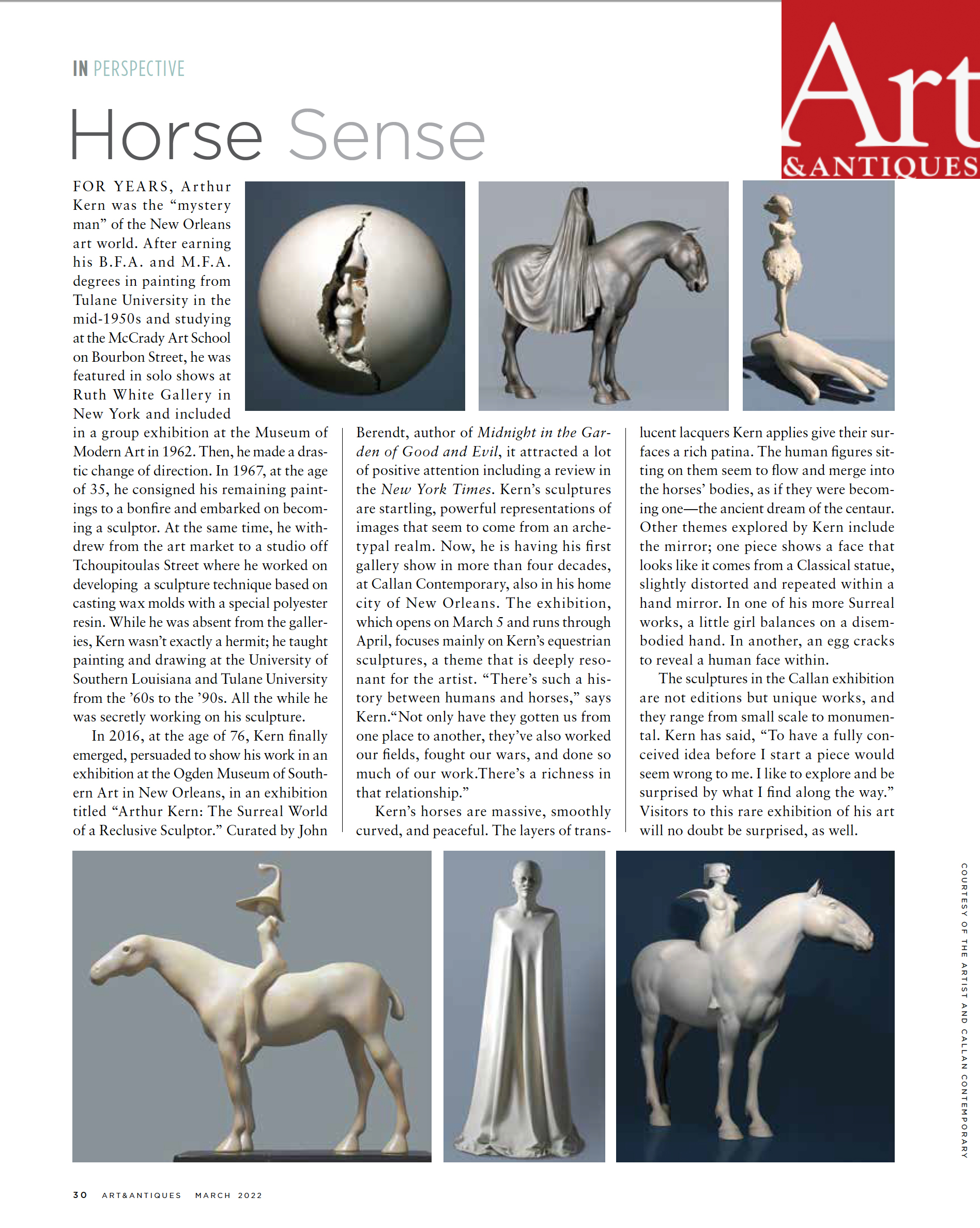 In 2016, at the age of 86, Kern finally emerged, persuaded to show his work in an exhibition at the Ogden Museum of Southern Art in New Orleans, in an exhibition titled "Arthur Kern: The Surreal World of a Reclusive Sculptor." Curated by John Berendt, author of Midnight in the Garden of Good and Evil, it attracted a lot of positive attention including a review in The New York Times. Kern's sculptures are startling, powerful representations of images that seem to come from an archetypal realm.